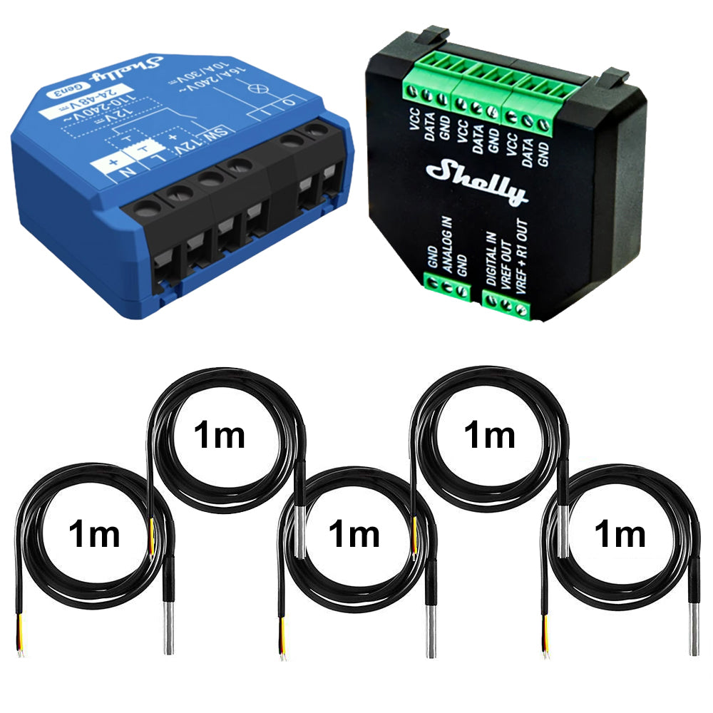 Shelly 1 Gen3 - without addon Shelly 1 Gen3 + Addon without DS18B20 Shelly 1 Gen3 + Addon + 1x-5x DS18B20 1M Shelly 1 Gen3 + Addon + 1x-5x DS18B20 2M Shelly 1 Gen3 + Addon + 1x-5x DS18B20 3M Shelly 1 Gen3 + Addon + 1x-5x DS18B20 5M Shelly 1 Gen3 + Addon + 1x-5x DS18B20 10M