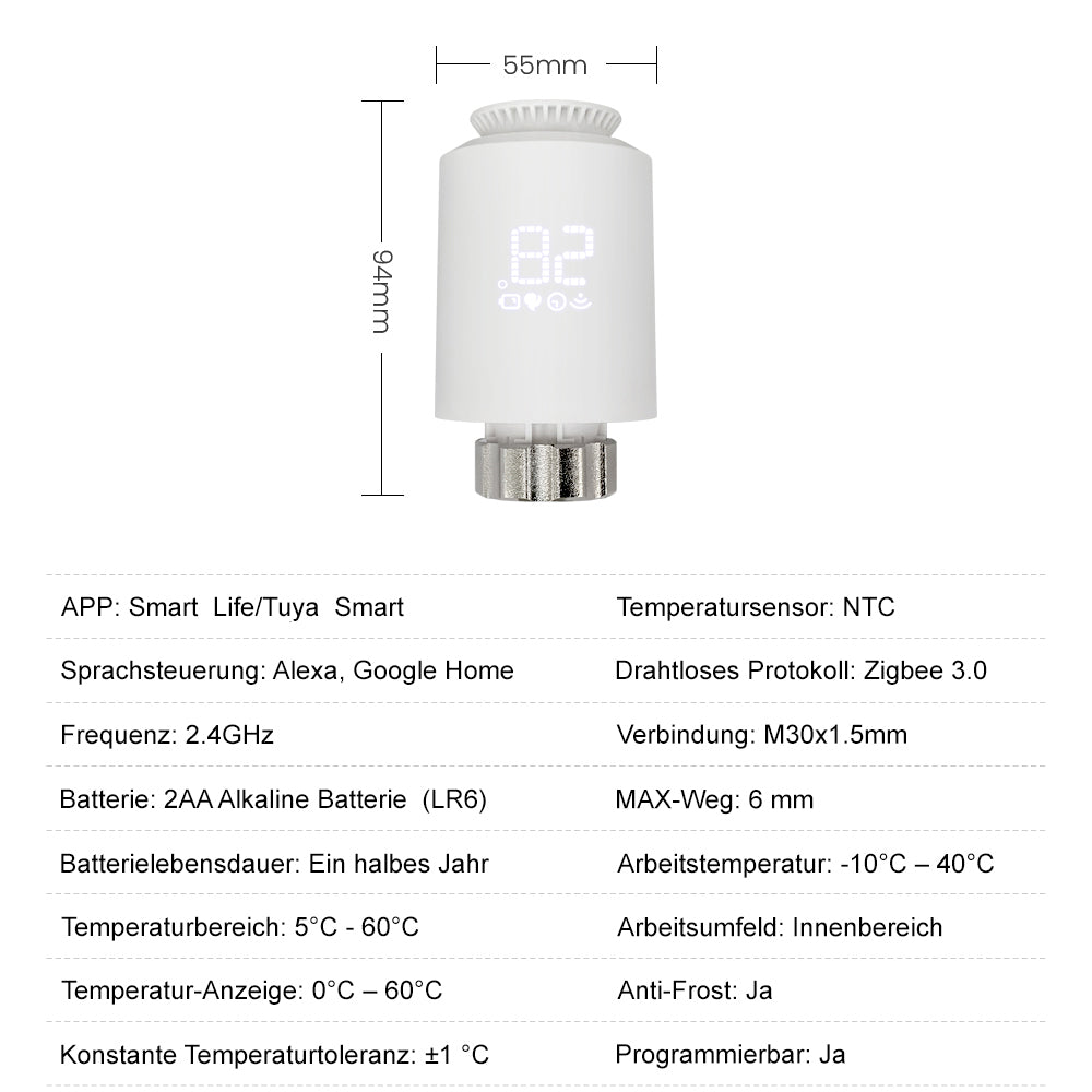 Mach deine Wohnung angenehm warm. Mit dem intelligenten Thermostatventil Avatto TRV06 ist es möglich, es von fast überall auf der Welt über die Tuya-App aus der Ferne zu steuern und Zeitpläne für den Betrieb zu erstellen. Mit einem Zigbee Hub (nicht im Lieferumfang enthalten) lassen sich alle Funktionen nutzen, die das Thermostatventil bietet. Er funktioniert auch mit intelligenten Sprachassistenten. Er verfügt über eine Reihe praktischer Funktionen, darunter die Erkennung offener Fenster, Entkalkung und Frostschutz. Außerdem verfügt es über ein LED-Display für den einfachen Zugriff auf die wichtigsten Informationen.