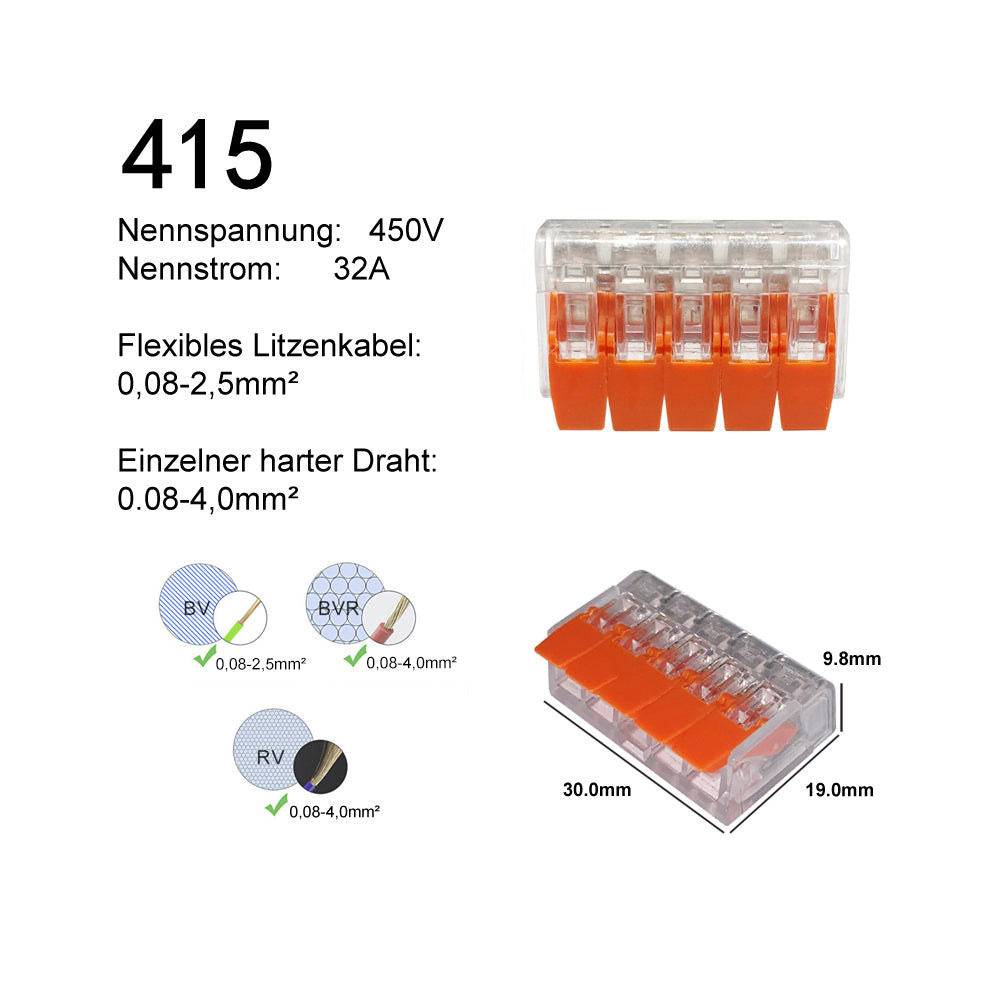 Hebelklemme Verbindungsklemme Kabelklemme Orange 415 5 Leiter 10-100 Stück