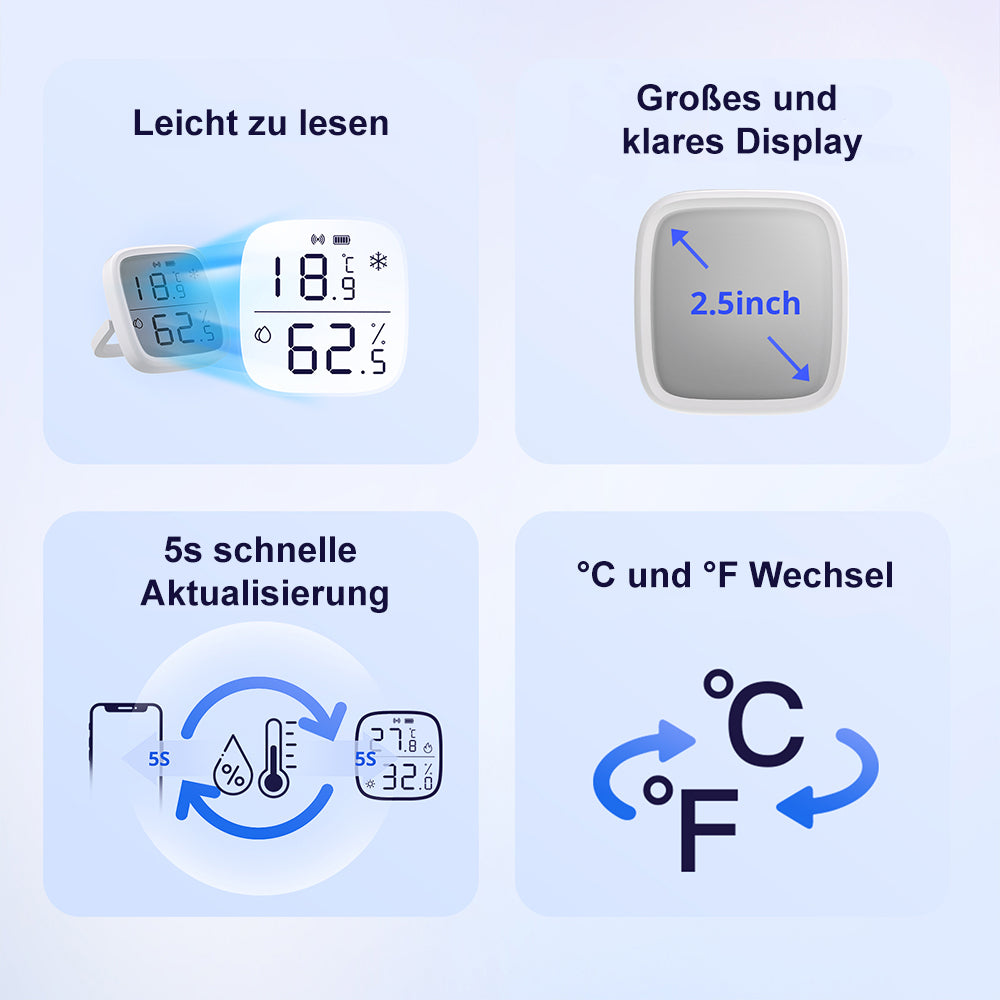 Eingebauter intelligenter Hygrometersensor aus der Schweiz, der genauere Messwerte liefert, indem er eine Genauigkeit von ±0,2°C/±0,4°F bei der Temperatur und ±2%RH bei der Luftfeuchtigkeit beibehält. Die Messwerte werden alle 5 Sekunden aktualisiert.