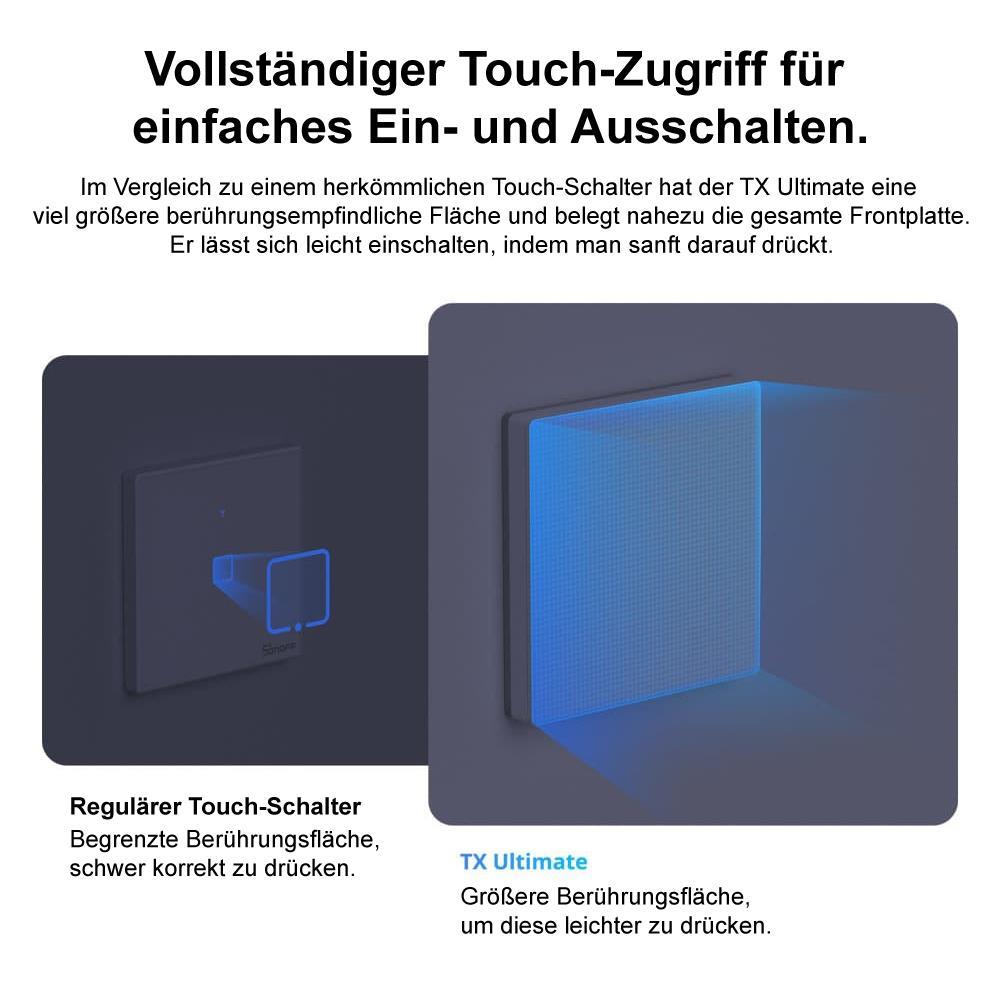 Vollständiger Touch-Zugriff - Im Vergleich zu einem herkömmlichen Touch-Schalter verfügt TX Ultimate über eine viel größere berührungsempfindliche Fläche, die nahezu das gesamte Bedienfeld einnimmt. Mit einer leichten Berührung ist es einfach, es ein- oder auszuschalten.